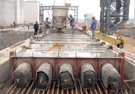 澆筑采用一次成型工藝,由一端向另一端全斷面推進(jìn),或者由中間同時(shí)向兩端推進(jìn)。同斷面橡膠氣囊澆筑順序?yàn)榈装濉⒏拱濉㈨敯澹侄畏謱友h(huán)推進(jìn),每段約3cm長,在前一段混凝土初凝前橡膠氣囊澆筑下一段混凝土,段與段之間不產(chǎn)生冷縫。橡膠氣囊澆筑底板混凝土底板橡膠氣囊澆筑從端頭及頂板預(yù)留工作孔下灰,用50插入式振搗棒振搗,插點(diǎn)均勻、嚴(yán)密、不得漏振。底板橡膠氣囊澆筑完成一段后,將芯模部分的活動模板壓緊、固定,立即橡膠氣囊澆筑腹板混凝土。腹板混凝土橡膠氣囊澆筑采用對稱分層下灰的方式進(jìn)行,分層厚度不得大于30cm,腹板混凝土的振搗采用復(fù)合振搗的方法,先用插釬特別
